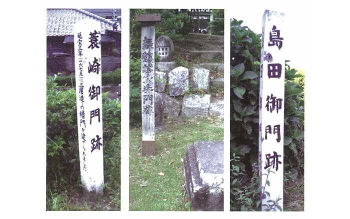 城堀の内側には南入口の蓑崎門・表門の大手門・北入口の島田門の3ヵ所があり、3代藩主・種信の時、延宝3年(1675 年)に完成している。