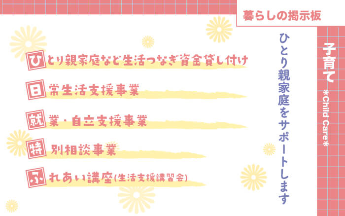 ひとり親家庭が、一時的に生活援助や保育サービスが必要な場合に、家庭生活支援員による支援をします(ただし、一定の所得以上の人は有料)。