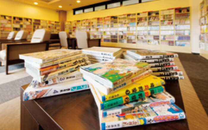 ルートイングランティアあおしま太陽閣』では、入浴すると、このマンガコーナーを無料で利用できます。週末はほぼ満席! 今後は小説も置く予定とか。