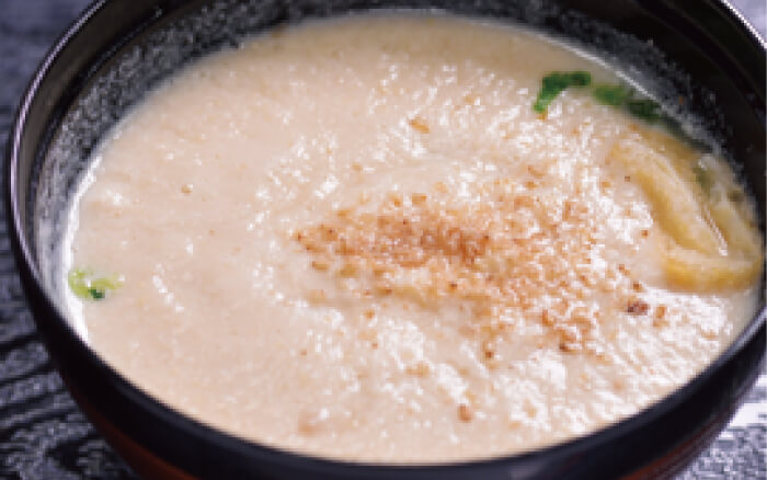 大豆を水につけて1日。昆布、しいたけ、いりこ、けずり節などのダシをとるのに1日。シンプルに見えて、結構手間がかかっているんです。地元の大豆を細かくすり潰して、自慢のダシとみそを絡めたアツアツの呉汁……!
