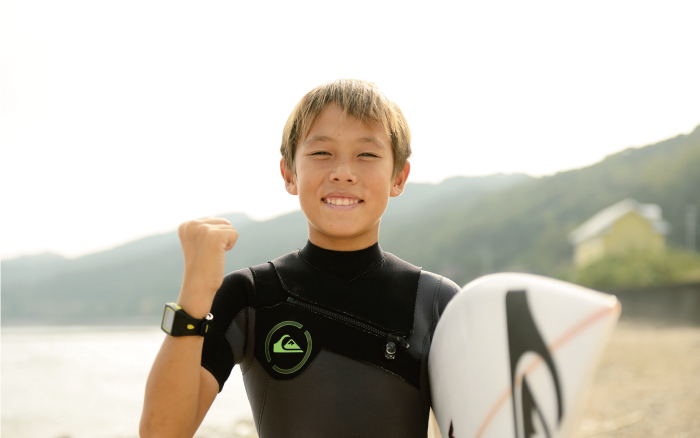 同じ歳の子がサーフィンをしている動画を、お父さんと一緒に見たことがきっかけでした。以来サーフィンを続けてきたそうです。