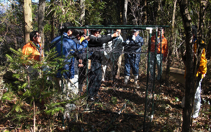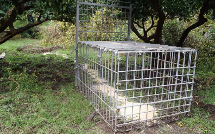 ▲村内4 ヶ所に設置されたサルの囲いわな。1つの群れごと捕獲できる大きさです。