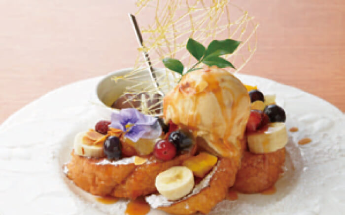 キャラメルソース&シロップがしみこんだバケットに果物。その上には、さらにキャラメルアイス。