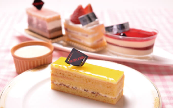 オレンジの甘酸っぱさが効いたカスタードクリームと、アーモンドを使用した生地をサンドした華やかなケーキ。
