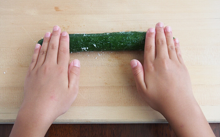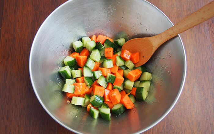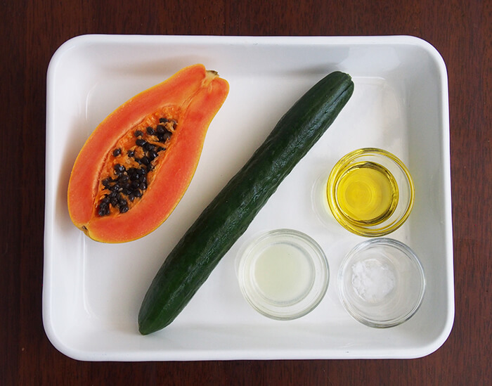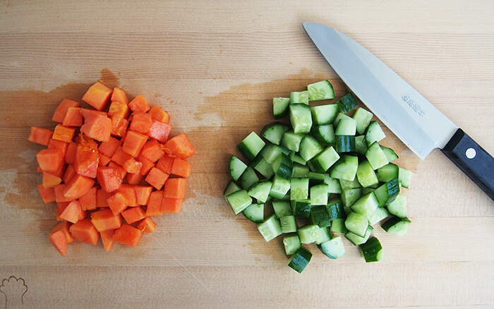 きゅうりの緑色とパパイアの橙色が鮮やかです。食感の違いも楽しいサラダです。