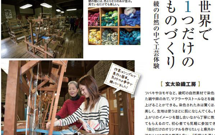 ツバキやヨモギなど、綾町の自然素材で染色した絹や麻の糸で、マフラーやスト-ルなどを織り上げることができる。染色された糸は驚くほど美しく、生地は使うほどに肌になじんでくる。仕上がりのイメージを話し合いながら丁寧に教えてもらえるので、初心者でも気軽に参加でき、「自分だけのオリジナルを作りたい」と県外から泊まりがけで来る常連も多い。「手織りを通して自分に向き合うと、新しい自分自身を再発見できるんです。そしてもっと自分自身を楽しんでほしい」と話すのは工房を主宰する日髙正一郎さん。手織りを通した新しい世界を、ぜひ一度体験してみてはいかがだろう。