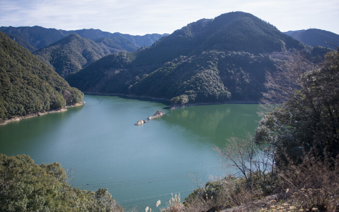高台にある学校跡からは、もともと集落があったダム湖が一望できます。「ダム湖ができた当時は、珍しさもあって観光名所だったんですよ。村営の観光ボートもありました」と話すのは秀憲さん。「当時は村が鯉の養殖も行っていて、年に2〜3回、村をまわって販売していました。多い時には1日で1tも売れたこともありました」と当時を懐かしみます。