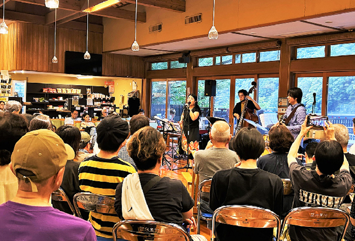 7月20日、西米良温泉ゆた~とで人と森と川のジャズフェスが開催され、夜の森と川に響く生演奏のジャズが来場者を魅了しました。