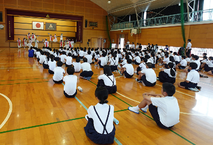 村所小は「神楽体操」を元気いっぱいに披露し、隈府小は美しい合唱で歓迎してくれました。