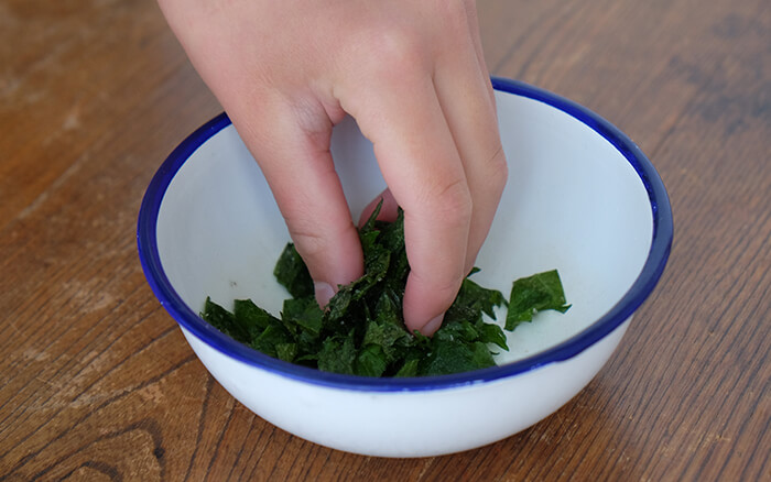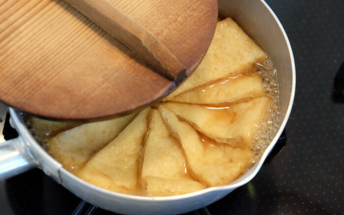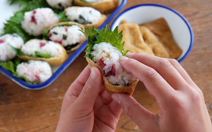 程よい甘さの油揚げに、大葉の香るすし飯を詰めます。