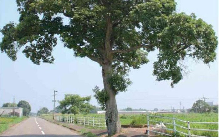 十号線から黒坂交差点を南東へ折れ、しばらく進むと、遠目からでも異彩を放つ大木が見えてきます。更に近づいてみると、その木はなんと、歩道の真ん中から生えています。近所に住む親子2人によると、この大きな「タブノキ」は、今から60年ほど前にこの付近に用水路ができたときにはすでにあったそうです。2人は、「良い日印になっちょっとよ。あっちゃならんけんあっておもしろいよね。田んぼが影にならんから幸い。」と話します。地元の人々が一休みできる日陰をつくってくれることや、その当時に良い木は残そうという考え方があったこと から、歩道は木の周りを半周するように設置され、木は残りました。この木は、これからも地元の名物として親しまれ、隣の道を初めて通る人を驚かせます。