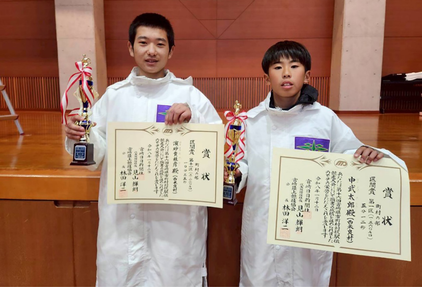 大会では、村内から初となる区間賞を1区中武太郎さん(村所小6年)と11区濵砂貴桂彦さん(西米良中2年)が獲得。