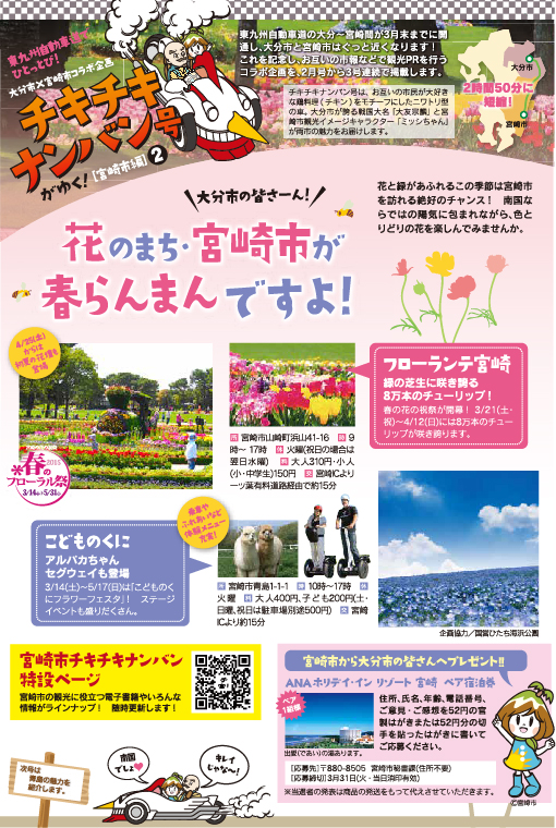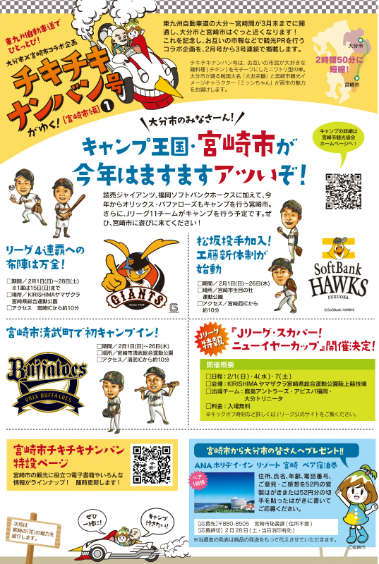 東九州自動車道の大分~宮崎間が3月21日(土)に開通し、大分市と宮崎市はグッと近くなります! これを記念し、お互いの市報などで観光PRを行うコラボ企画を、2月号(大分市は毎月1日号)から3号連続で掲載します。