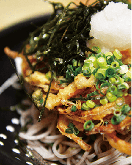館内の食堂「萩之茶屋」で野菜たっぷりと評判の「かき揚げぶっかけ蕎麦」(650円)。