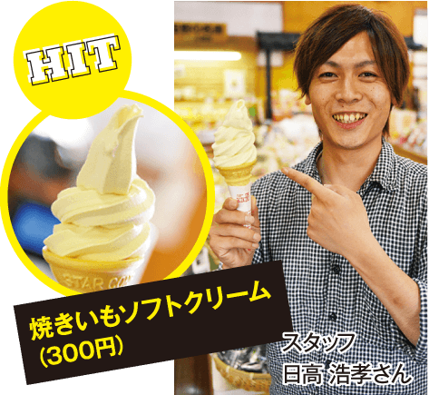 「焼きいもソフトクリーム」は特産のかんしょのペーストと、古代乳製品として知られる甘乳蘇(かんにゅうそ)を使ったもの。なめらかな口当たりで、食べるとかんしょの香りと甘乳蘇の深い甘みが口いっぱいに広がります。