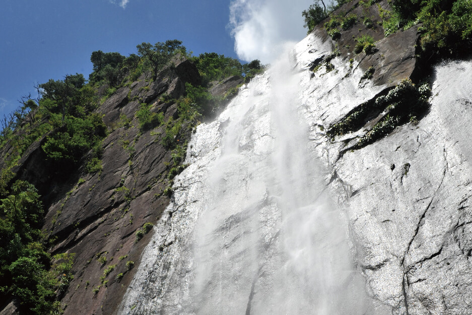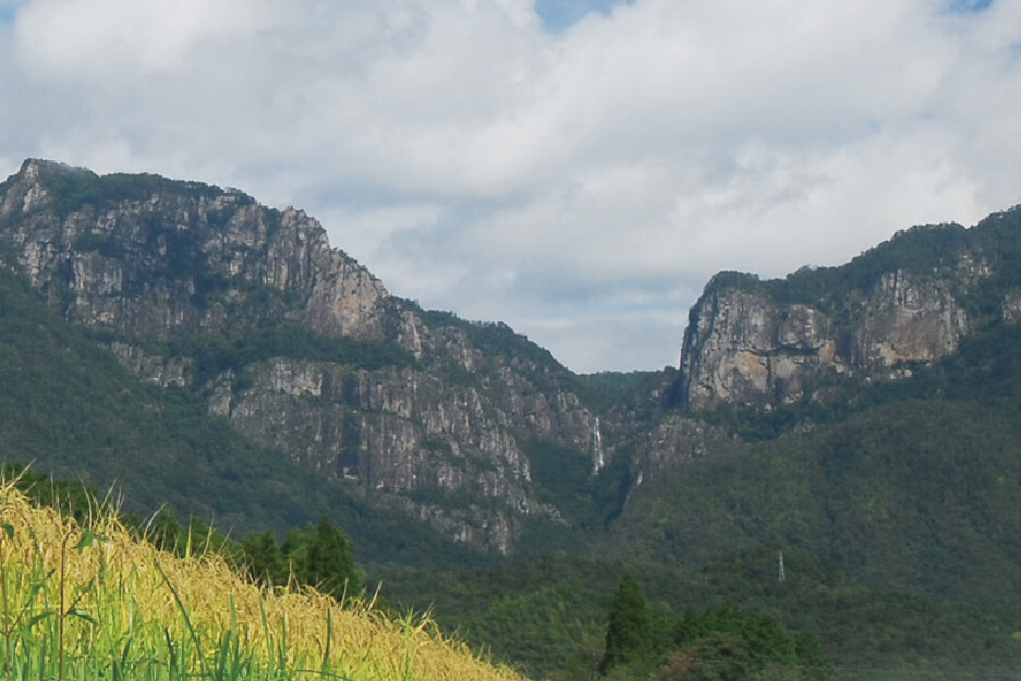 西側の雄岳(おだけ)、東側の雌岳(めだけ)と呼ばれる2つの岩峰からなる山で、切り立った岩々の絶壁が圧倒的な迫力で眼前に迫ります。山の姿が「むかばき」(武士が腰部から脚部にかけて袴の上から身につけた装飾品)に似ていることからその名が付けられました。