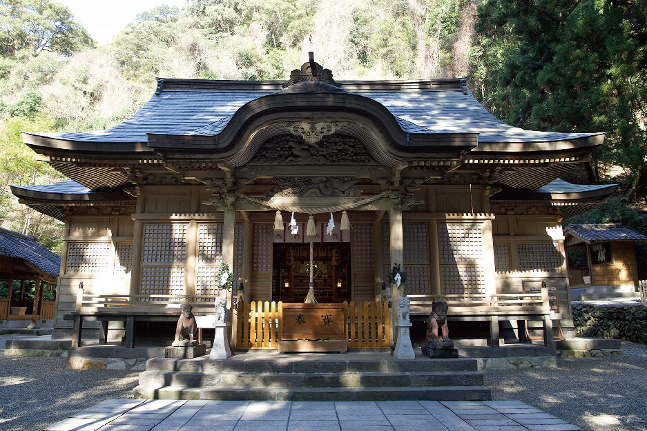 樹齢300年の夫婦杉や、社殿の前に据えられた猿のような顔つきの狛犬、さらに軒下に彫られた緻密な龍の彫刻など、思わず写真に収めたくなるシンボルがたくさん。見上げるほど高い木々に囲まれた参道は、心が洗われるような神聖な雰囲気に包まれています。