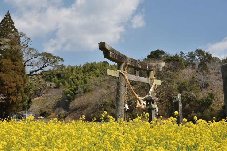 国道218号から行縢神社へと向かう途中にある小さな神社です。神社がある舞野町は、ヤマトタケルが熊襲を討伐した際、勝利の舞を舞った場所であることから名付けられた地名。2月から3月にかけて、神社周辺の菜の花畑が一斉に満開となり、辺り一面黄色い花で覆われる美しい景色が楽しめます。
