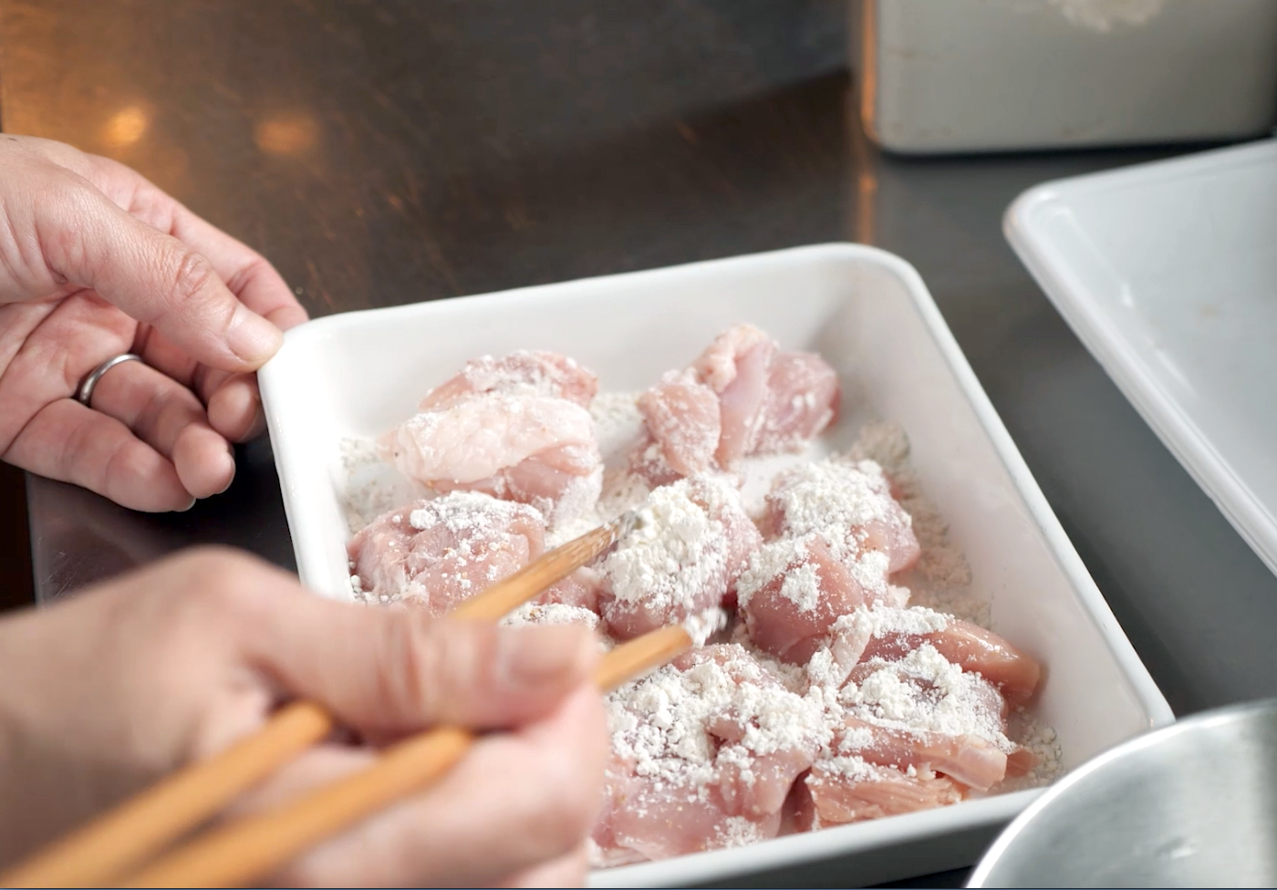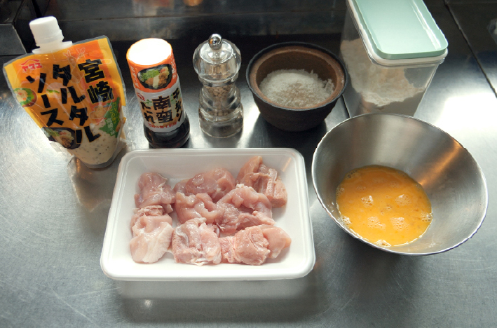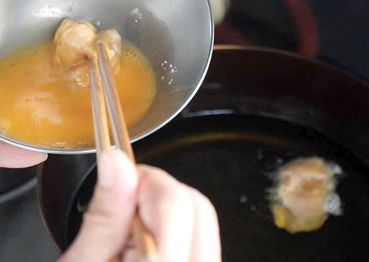 05 薄力粉をまぶした鶏肉を溶き卵にくぐらせて揚げ油に入れる