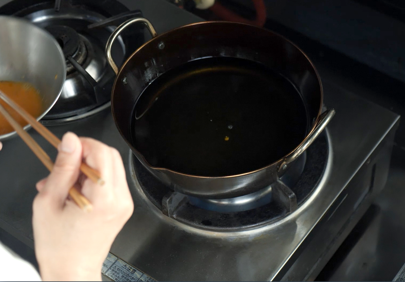 04 揚げ油を中火で熱し、菜箸で溶き卵を落とすとシュワッと浮かんでくる頃が揚げ始めのサイン