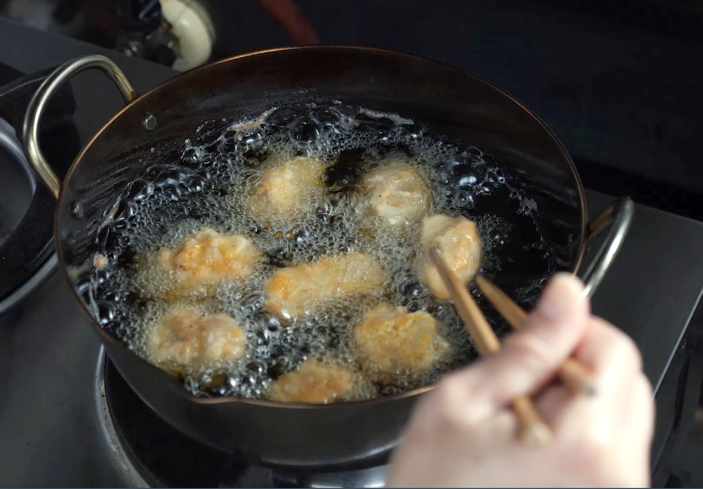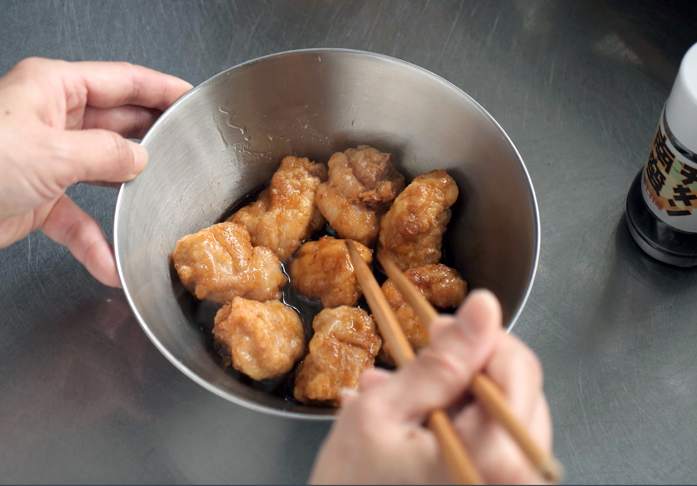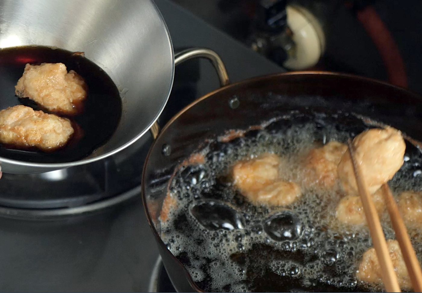 08 きつね色に揚がったら、油をきって熱いうちにタレの入ったボウルに入れる