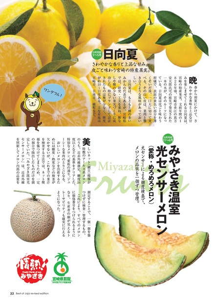 日向夏を美味しく食べるコツや、日向夏を使った加工食品をまとめてみました。 日向夏を美味しく食べるコツや、日向夏を使った加工食品をまとめてみました。 日向夏を美味しく食べるコツや、日向夏を使った加工食品をまとめてみました。 日向夏を美味しく食べるコツや、日向夏を使った加工食品をまとめてみました。 爽やかな甘みを楽しめる日向夏を是非楽しんでみて下さい♪ 日向夏は、江戸時代の文教年間。宮崎市の庭先に育っているのを偶然に発見されて広まった生粋の宮崎生まれ。 日向夏は宮崎生まれの果物です。 宮崎たべてん!2013 かんきつ「ニューサマーオレンジ」の栽培につきまして、町外からの通報により、これは日向夏だということが判明いたしました。 日向夏・ニューサマーオレンジ・土佐小夏は同じ物だそうです! 月刊パームス 9月号 No.262 特にブランドとして認証されたものは種が少なく、糖度が約10~11度ある。 研究・改良によってより美味しい日向夏がつくられました Jajaみやざきアピール号プレミアム 白皮(アルベド)の部分を付けたまま皿にそぎ落とします 日向夏の美味しい食べ方は、リンゴの皮をむくように外皮をはいで白皮の部分を残すことだそうです♪ みやざき食財NOTE(野菜/果物/菌茸類) 外皮の下の白い部分も一緒に食べます 残してしまいがちな白い部分ですが、 一緒に食べるのが日向夏を美味しく食べるコツだそうです。 日向神話旅 古事記編さん1300年 日向夏マーマレード 簡単なマーマレードは日向夏ティーやヨーグルトにピッタリ。 綾時間 Vol.3 綾夏ちゃん 日向夏を使ったジュースです。甘さとすっきりした酸味が特徴。 綾時間 Vol.2 「道の駅」フェニックス名物 ソフトクリーム! 日向夏を使ったソフトクリームを食べられます♪ 宮崎たべてん!2013秋冬号